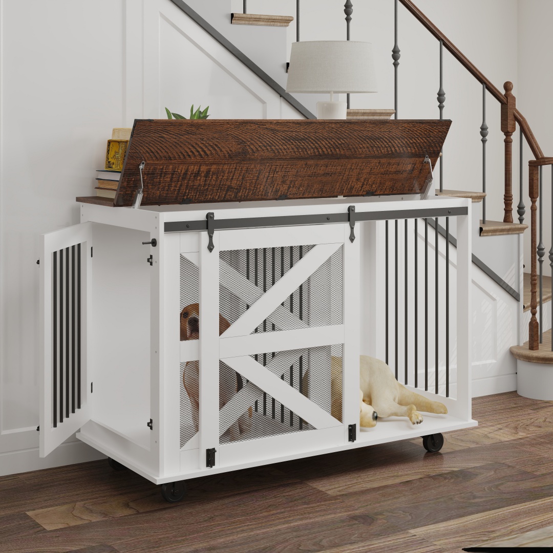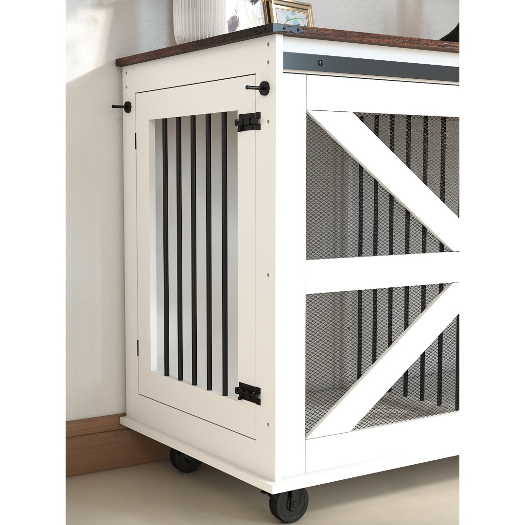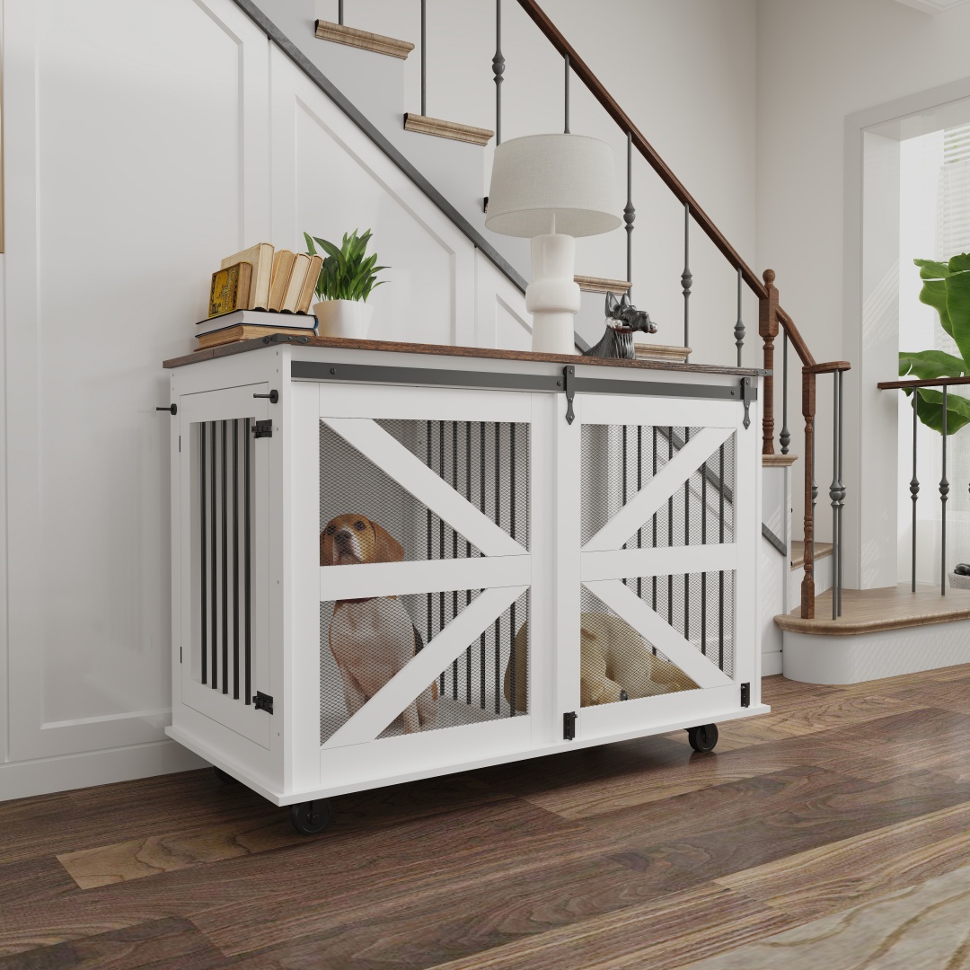 Key featuresFive wheels for easy moving and cleaning. Removable center divider — ideal for one large dog or two small dogs. The top opens to allow easy feeding and access to the dog. Designed with front and side access points to give your pet flexible entry/exit options. Furniture-style crate with barn door accent. Metal-cornered top and wood-grain finish offer durability and style.